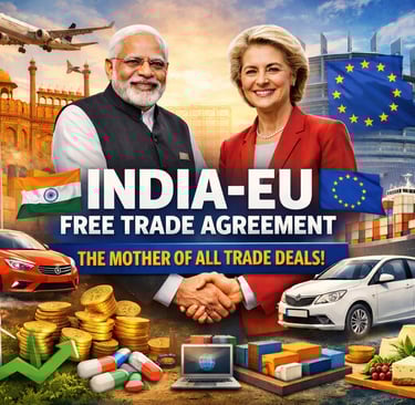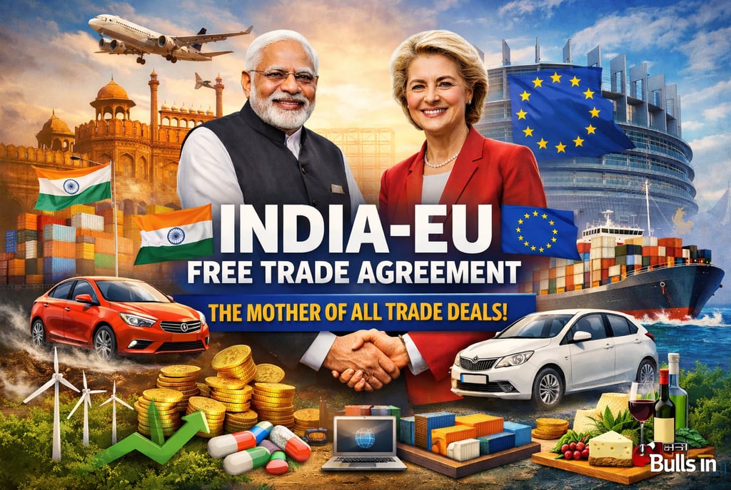 India and the European Union have finalized a historic “Mother of All Trade Deals” in 2026, marking a major shift in global trade dynamics. This in-depth blog explains what happened today, key highlights of the India-EU Free Trade Agreement, tariff cuts, sector-wise impact on automobiles, IT, textiles, pharma, and services, and how the deal will benefit Indian markets, exporters, and investors. Discover why this landmark agreement is being called a game-changer for the Indian economy and what it means for stock markets, FDI inflows, and long-term growth.